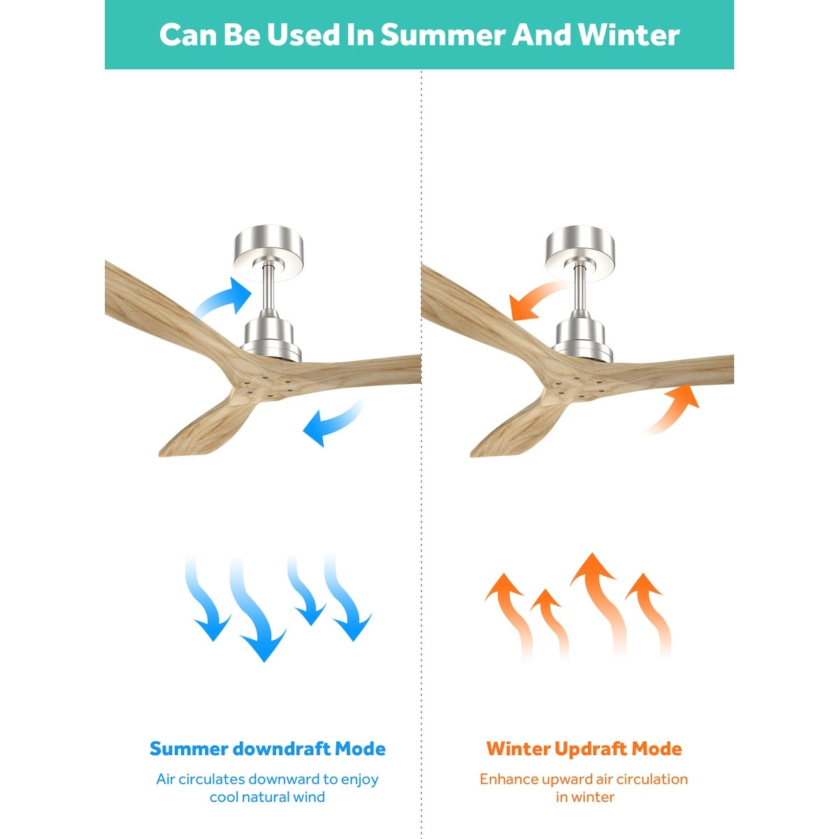 Ventilateur de plafond moderne en bois massif/ABS de 52 pouces avec télécommande (sans lumière), 6 vitesses de vent, flux d'air réversible