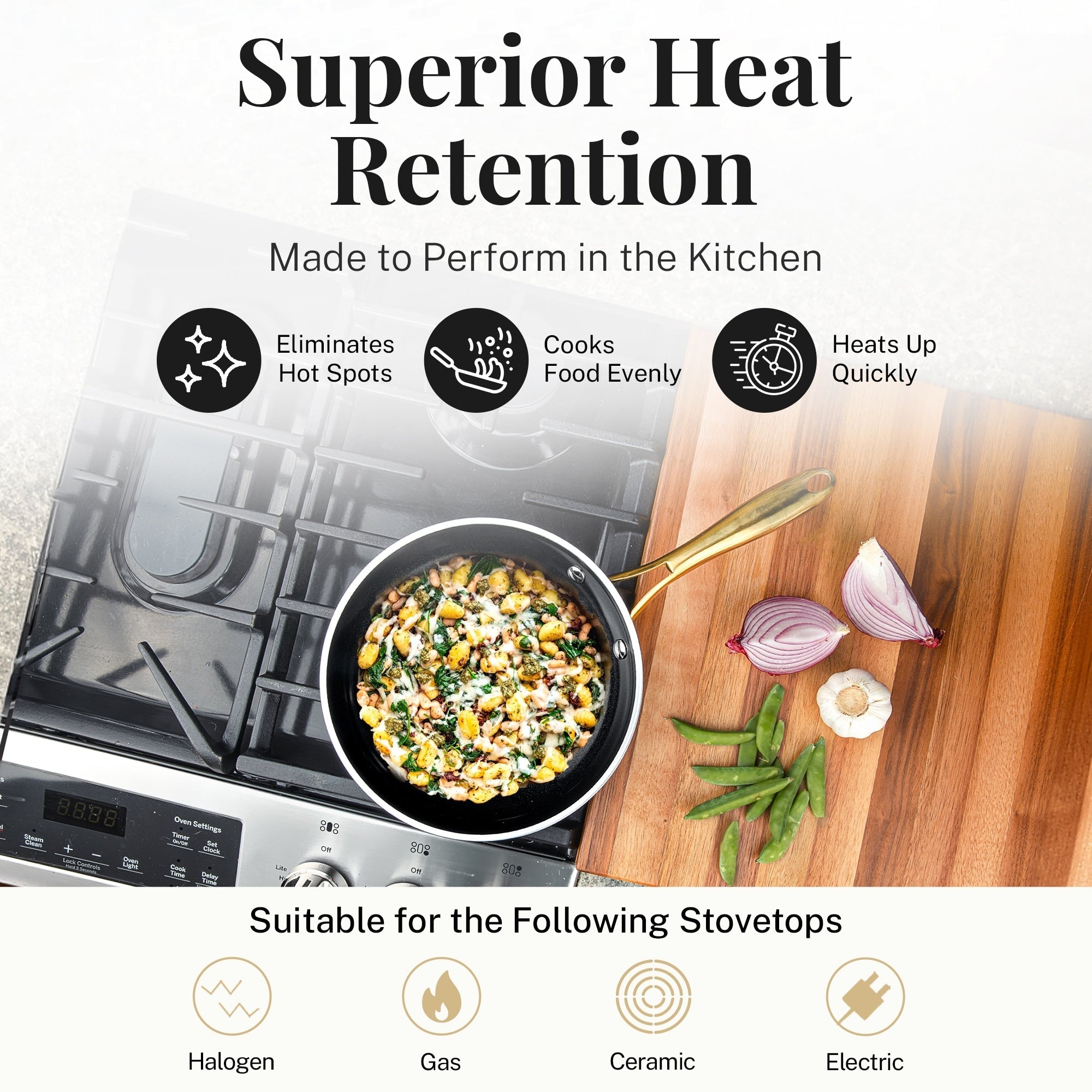 - Polyvalence du four et de la cuisinière : Convient aux cuisinières à gaz, électriques, en céramique et halogènes, et au four jusqu'à 500 °F, permettant une flexibilité de cuisson de la cuisinière au four.