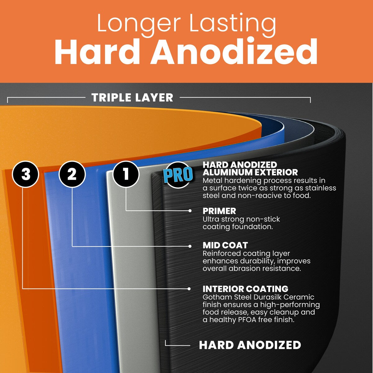 - Anodisé dur : Conçu pour durer, l'ensemble de batterie de cuisine Gotham Steel Pro Premier est fabriqué en aluminium anodisé dur, plus résistant que n'importe quel acier inoxydable ou aluminium ordinaire, offrant une conduction de chaleur rapide et uniforme à travers les ustensiles de cuisine, tout en résistant à l'usure et en garantissant des années d'utilisation exceptionnelle de chaque pièce de batterie de cuisine.