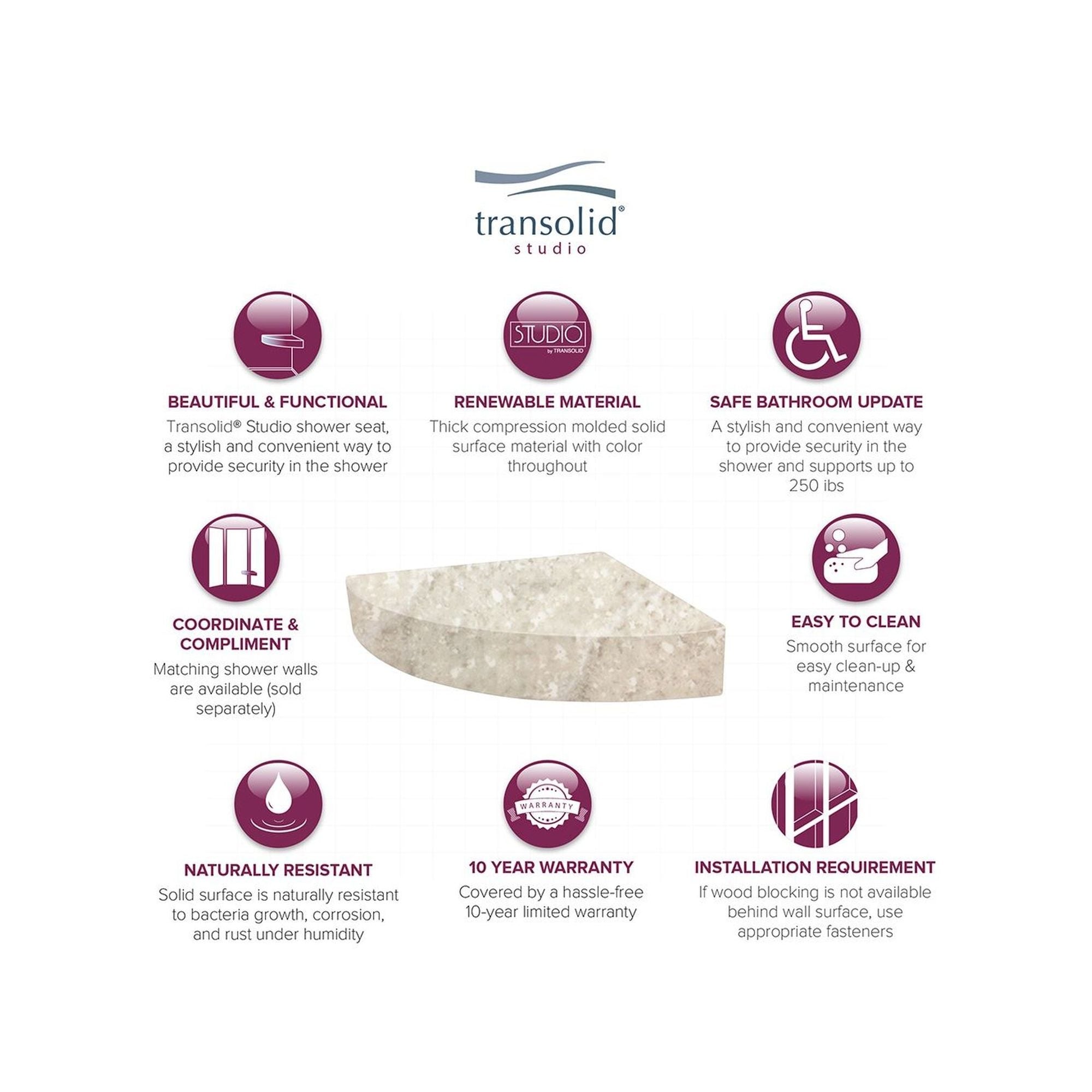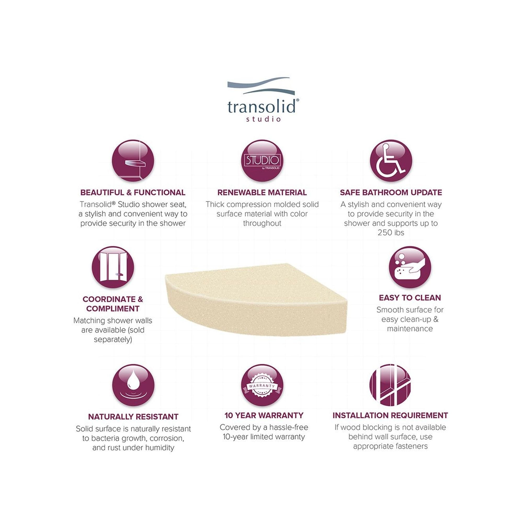 Siège de douche d'angle mural en surface solide Transolid Studio 14 po x 14 po - 14,5 x 14,25 x 3